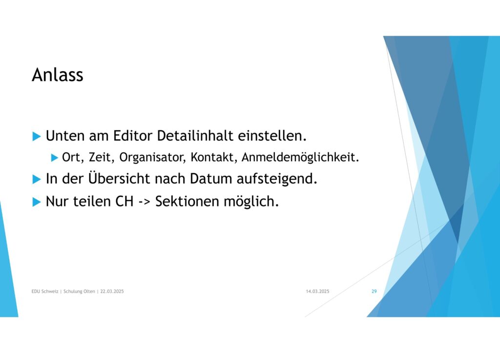 • Ort, Zeit, Organisator, Kontakt, Anmeldemöglichkeit.